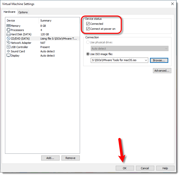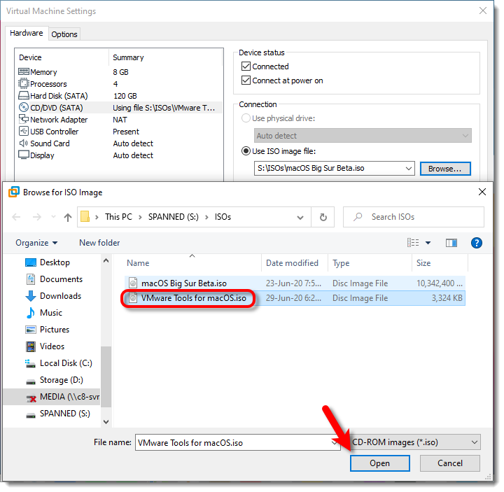 - Go to your macOS Big Sur Virtual Machine Settings > CD/DVD (SATA) > Use ISO image file > Browse > locate & select the VMware Tools you downloaded from the link above and click Open.