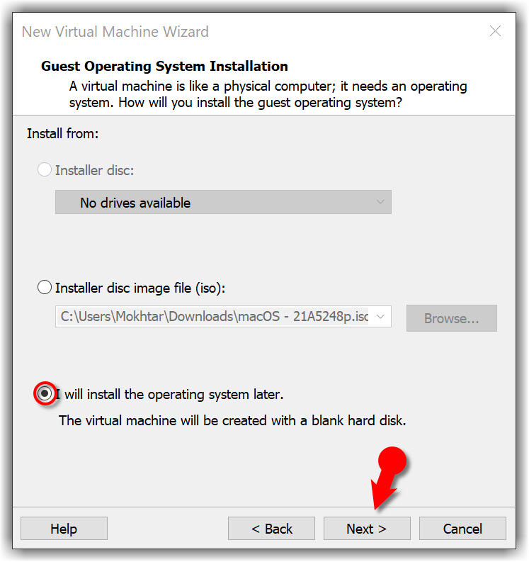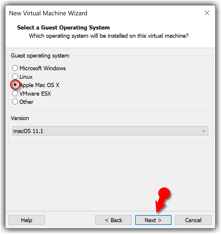 #2. Now, select I will install the operating system later and click Next. Choose Apple Mac OS X from the operating system list then select macOS 11.1 from the version drop-down list and click Next.