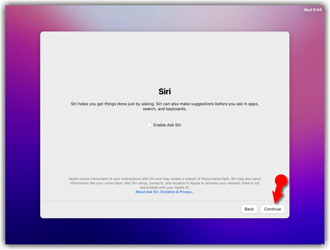 - Uncheck Siri and click Continue.