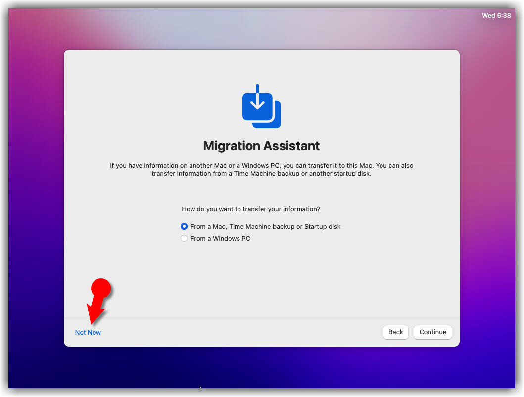 - On the Migration Assistant page, click the Not Now button to continue.