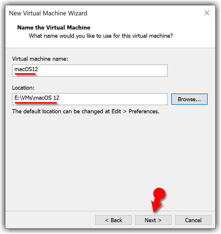 #3. Name the virtual machine as you prefer like macOS Monterey. Click Browse then choose a location to save virtual machine files and click Next, or you may let it as default.