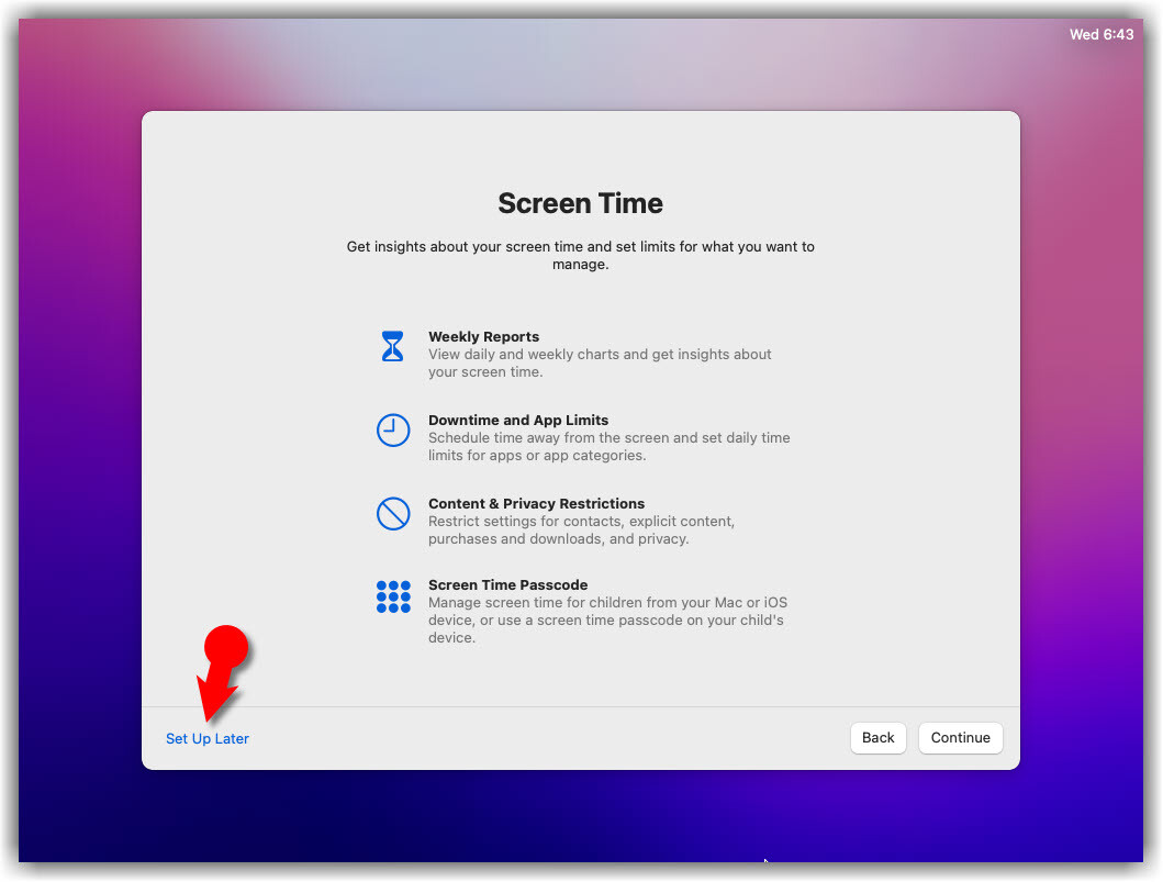 - On-Screen Time, click Set up Later.