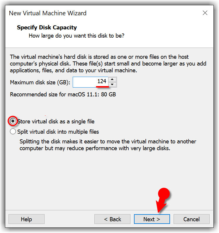 #4. Specify the disk size of 124 GB or more than 50 GB. Then select Store virtual disk as a single file and click Next.