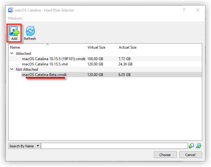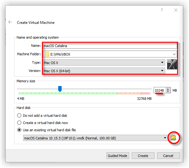 - Hard Disk: Select Use an existing virtual machine hard disk file. Click on the Folder icon to browse the macOS Catalina VMDK file.