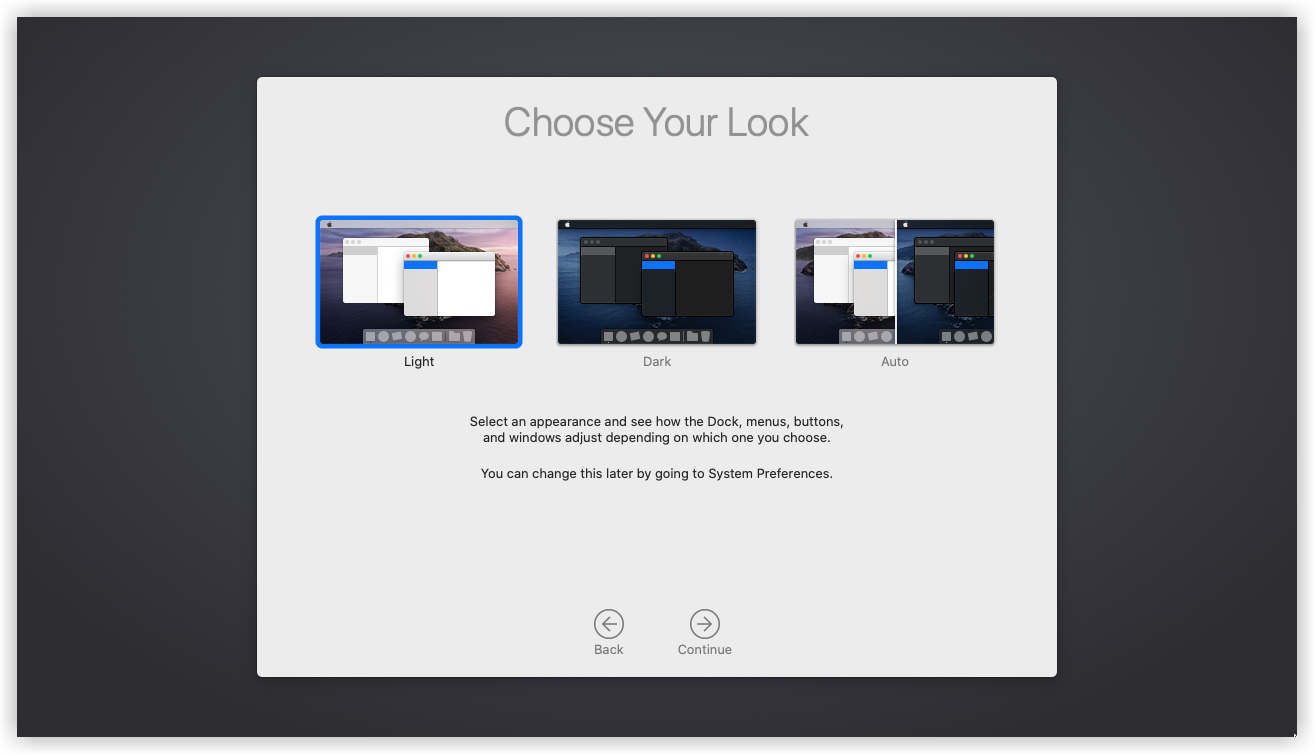 - Select an appearance theme and click Continue. You can choose between dark mode or light and Auto mode.