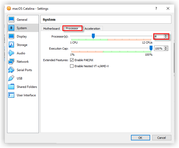 - It’s time to edit the virtual machine to make it works. Select macOS Catalina VM and click on Settings. Now, bring the following changes to macOS Catalina VM.