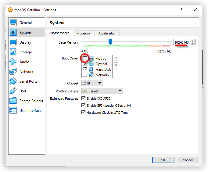 - Under System>Motherboard, increase the Base Memory to 10248MB. However, you can use a bit lower memory if your system doesn’t have this much RAM.