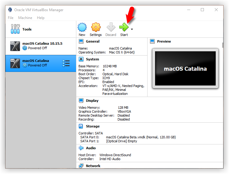- Now, that you’ve executed the macOS Catalina VirtualBox code. Open the VirtualBox app then click the Start button to power on the VM. A black screen with a lot of white text will appear on the screen. Just wait for a few minutes and the macOS Catalina installation will start.