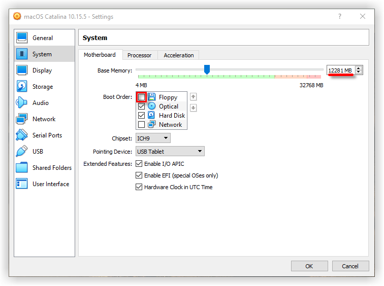 - Under System>Motherboard, increase the Base Memory to 12281MB. However, you can use a bit lower memory if your system doesn’t have this much RAM.