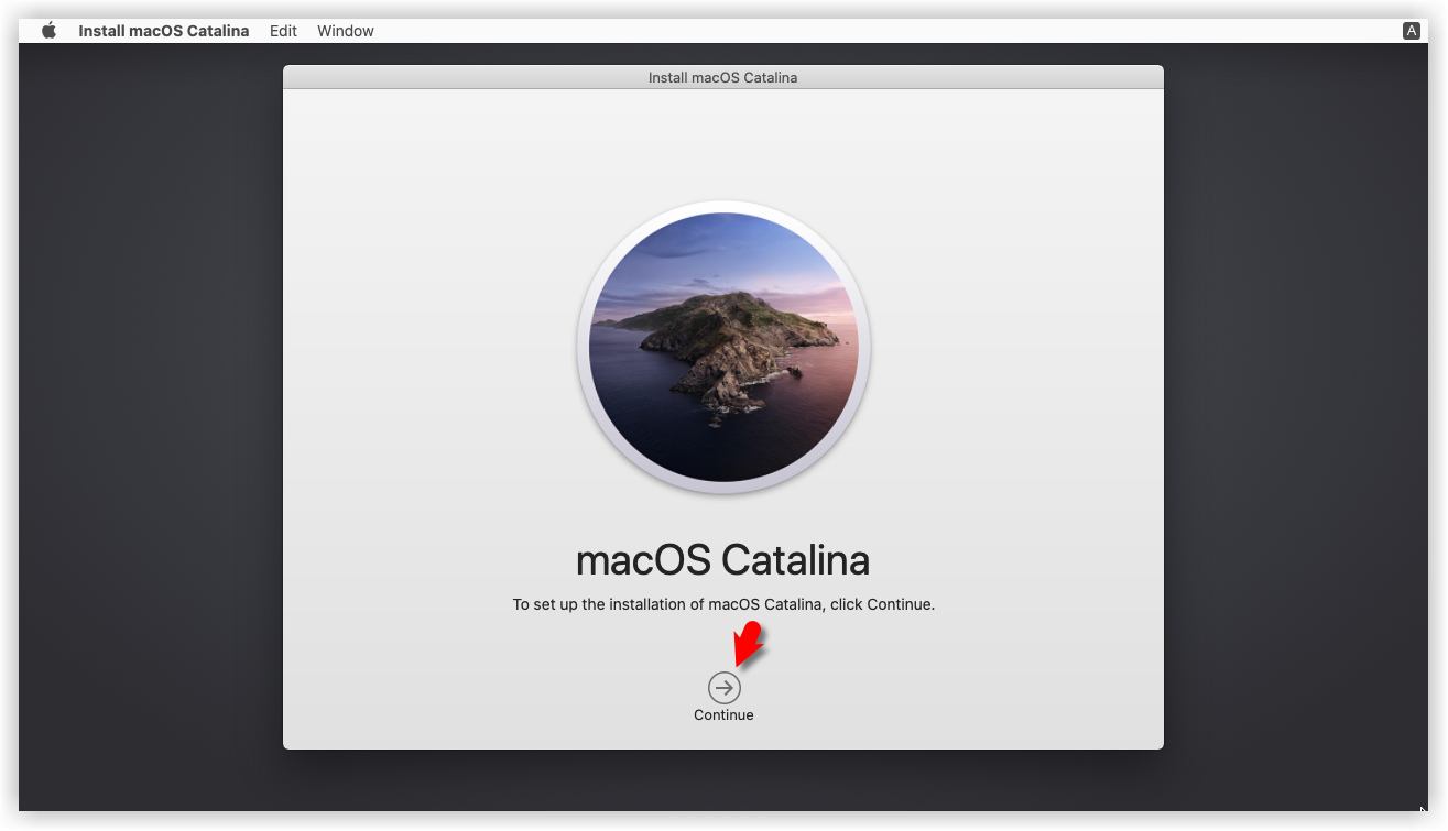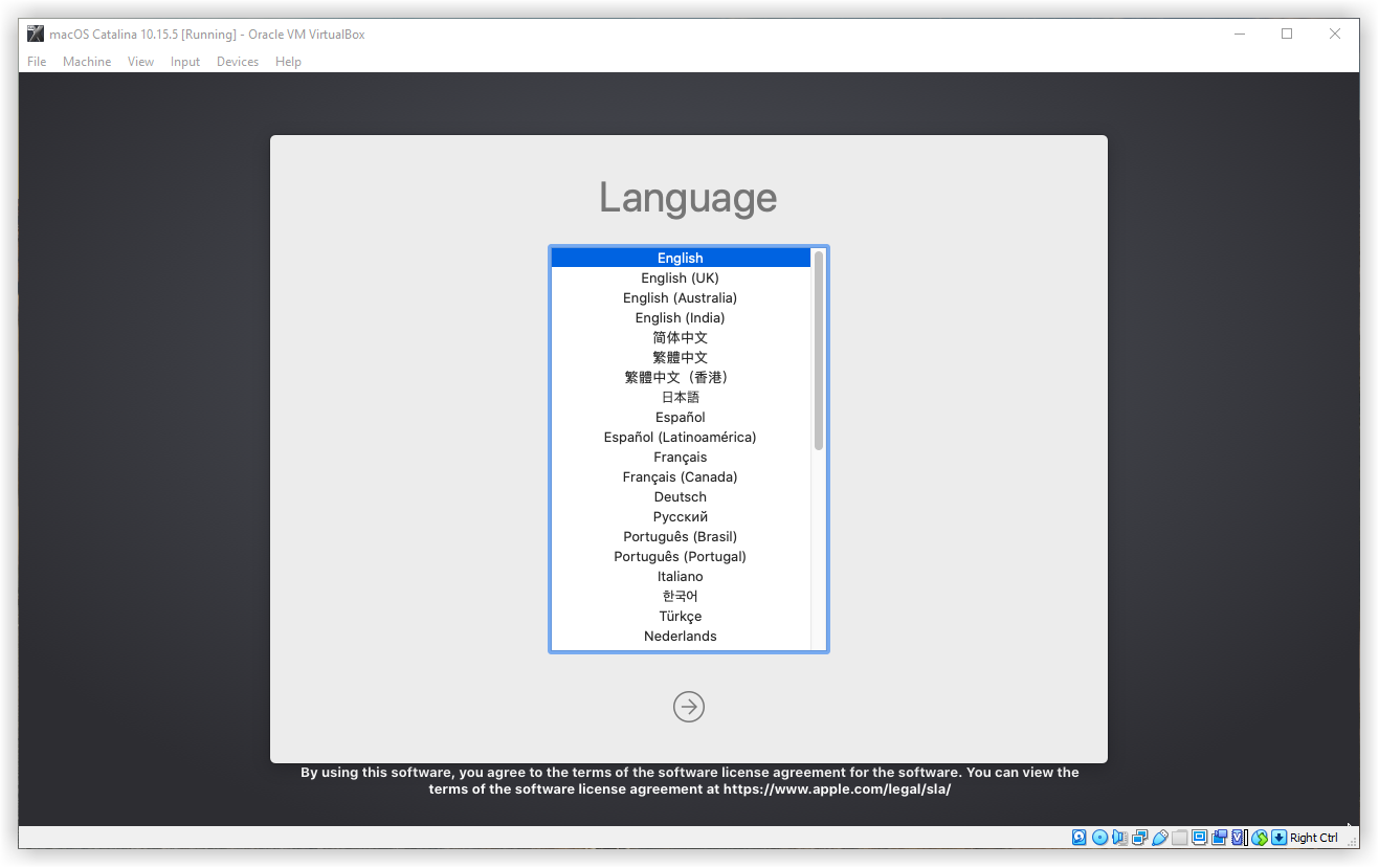 - Once you start your VM, a whole bunch of code will run on the screen, but you should not be worried about it. Wait for a few minutes, and you should see the macOS Catalina Language window. Select your Language and click Continue arrow.