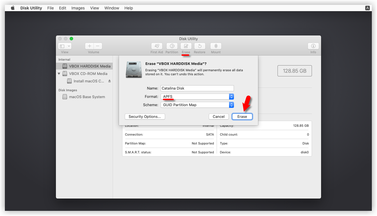 - Select your main VHD Disk and click the Erase button. Choose the following options and again click Erase.