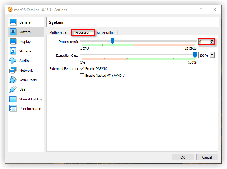 - It’s time to edit the virtual machine to make it works. Select macOS Catalina VM and click on Settings. Now, bring the following changes to macOS Catalina VM.
