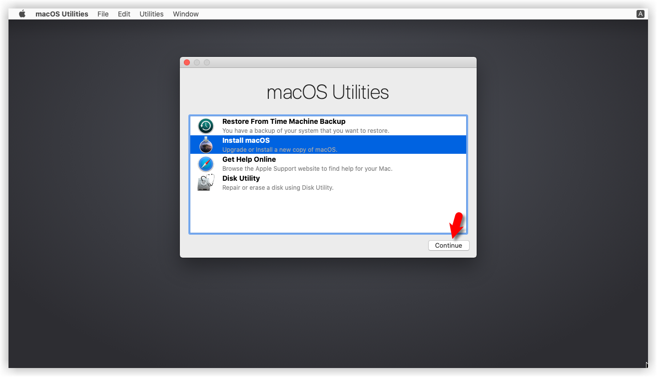 - Now, you’ll see macOS Utilities Window. From the list, select Disk Utility and click Continue.