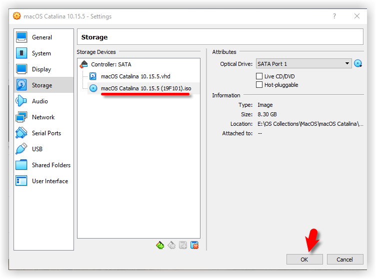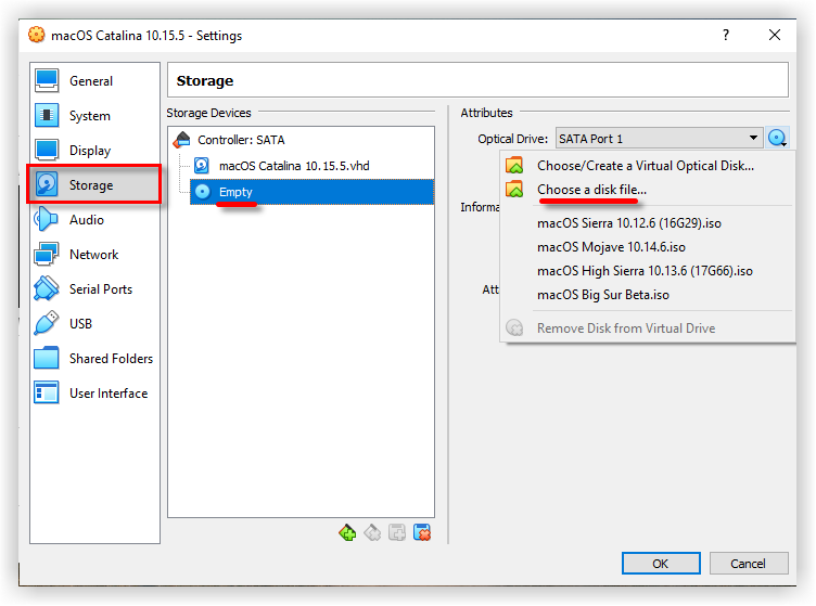 - From the Storage section, click on the Empty>DVD icon. Click on Choose a disk file. You should select macOS Catalina ISO which you’ve downloaded from the “Required Files” section of this post. Finally, click OK to close the macOS Catalina Settings window.