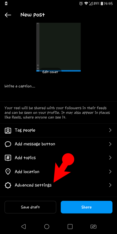 - On the final window of sharing your post where you can write captions, add hashtags, etc, scroll down to the end. Find Advanced settings and tap on it.