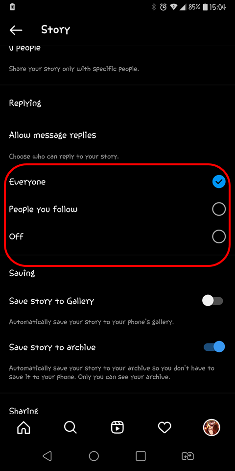 - Under the replying section, tap on off. Also, you can configure the settings about who can comment on your story such as your followers and the followers that you follow back.
