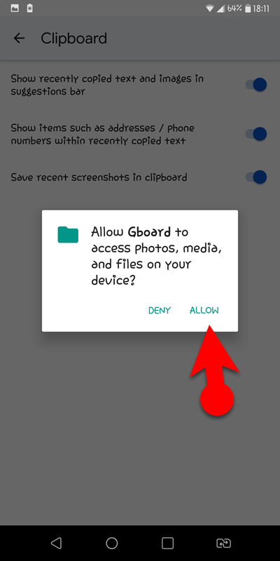 - Then allow the GBoard to access the media file by tapping on allow.